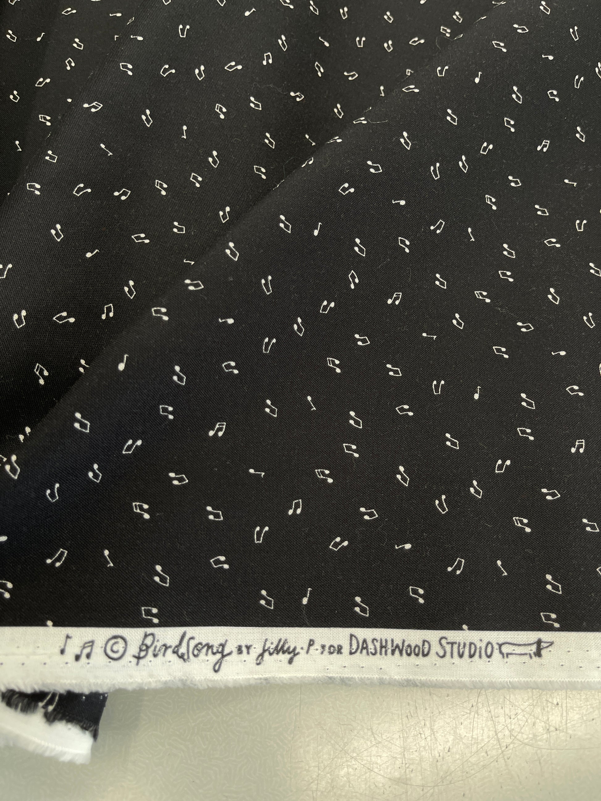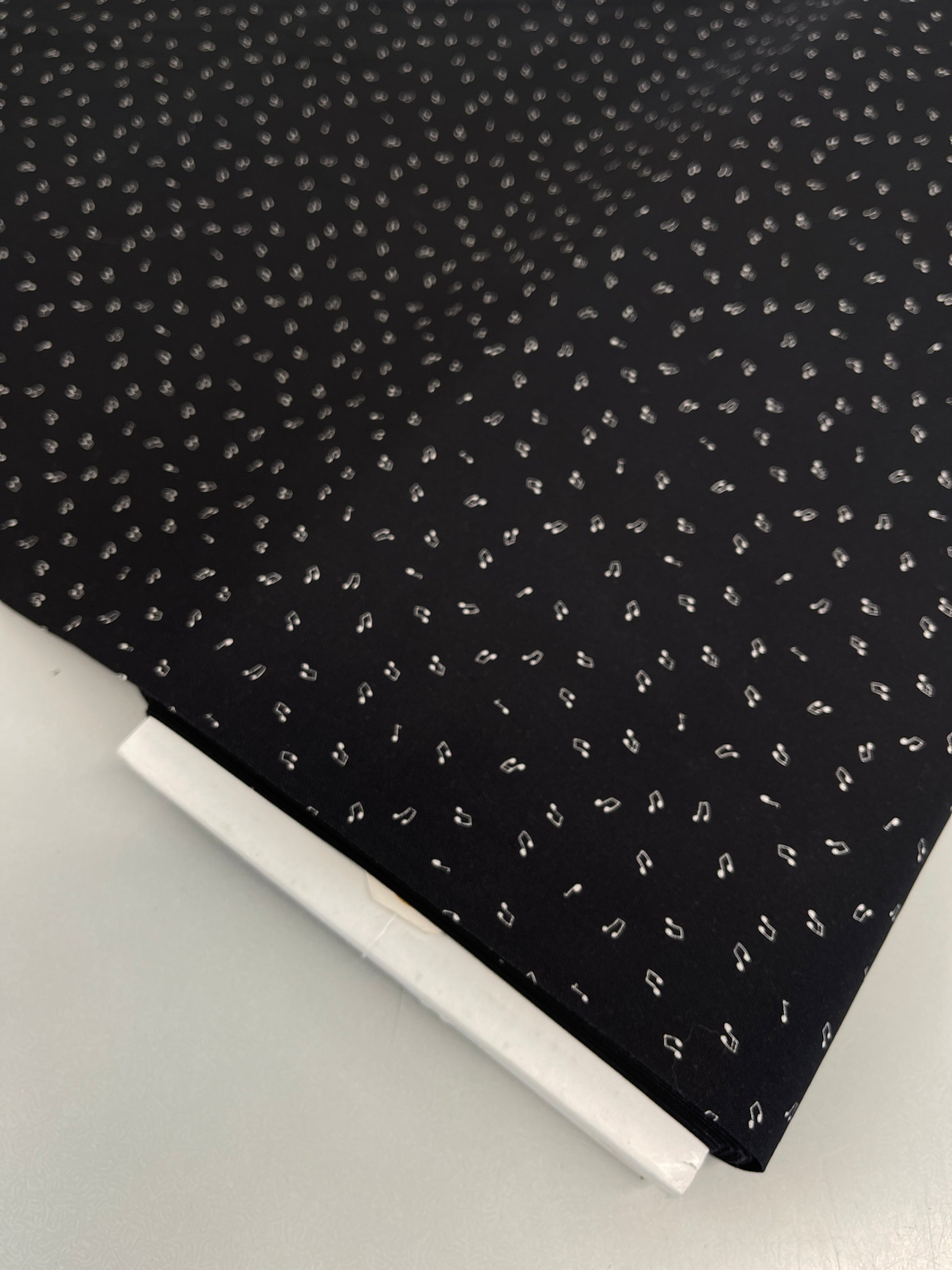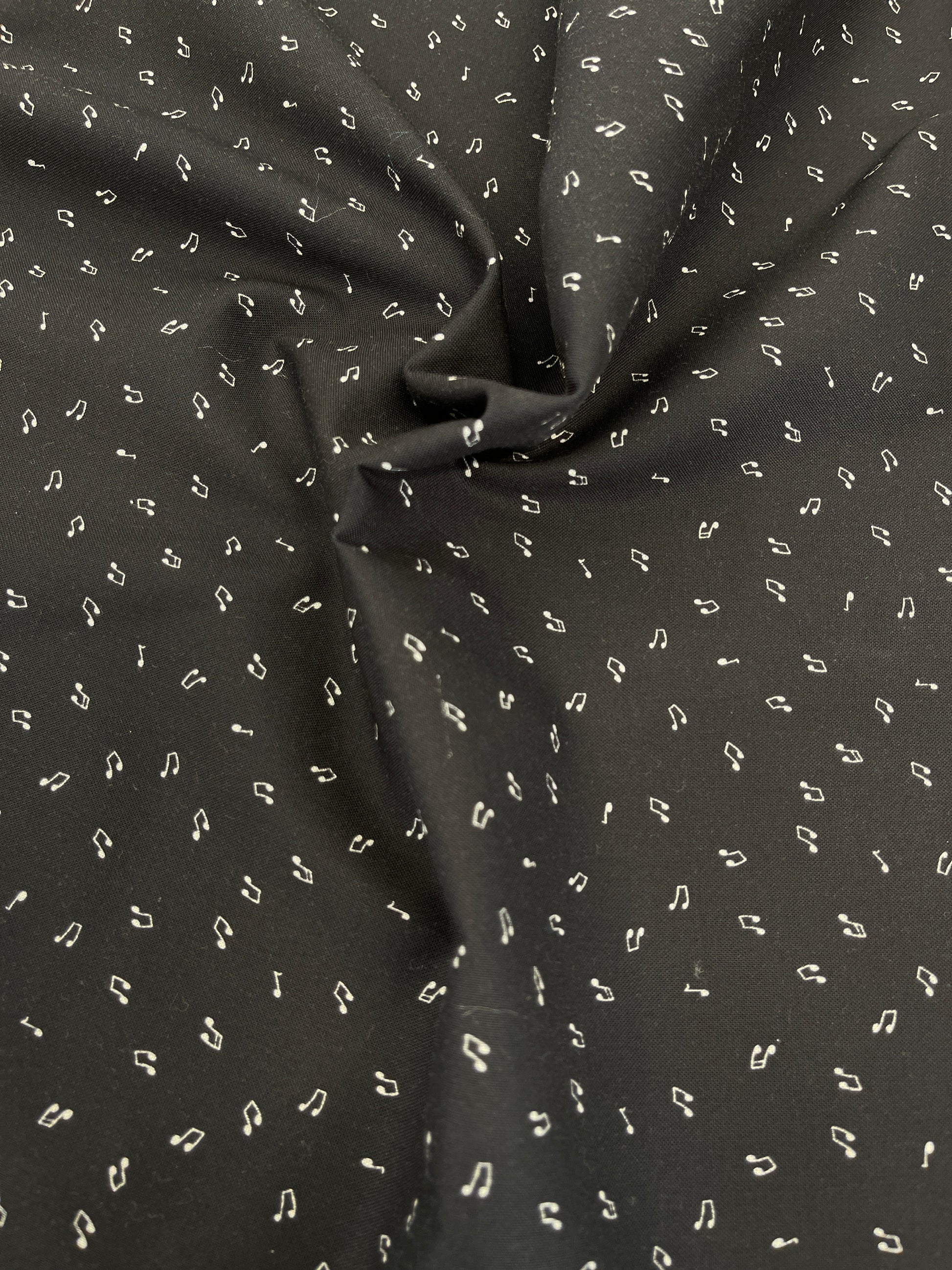 A fun novelty fabric featuring white musical notes on a black background. In 100% cotton perfect for dressmaking, patchwork and quilting.