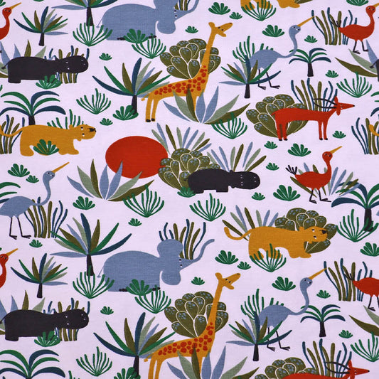 A gorgeous, fun and quirky tropical fabric featuring jungle animals such as a tiger, leopard, zebra and pink monkey in a tropical setting with green and turquoise leaves on a black background. In high quality 100% cotton which also meets OEKO-TEX 100 this is perfect for dressmaking and quilting, suitable for children and adults alike.