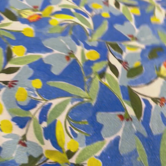 Beautiful linen and viscose blend fabric featuring a modern floral print with yellow, green and orange on a blue background. Perfect for summer dressmaking.