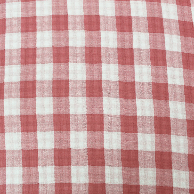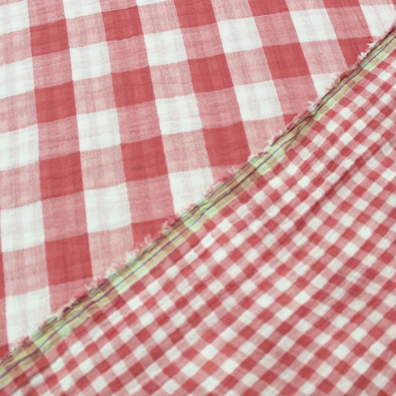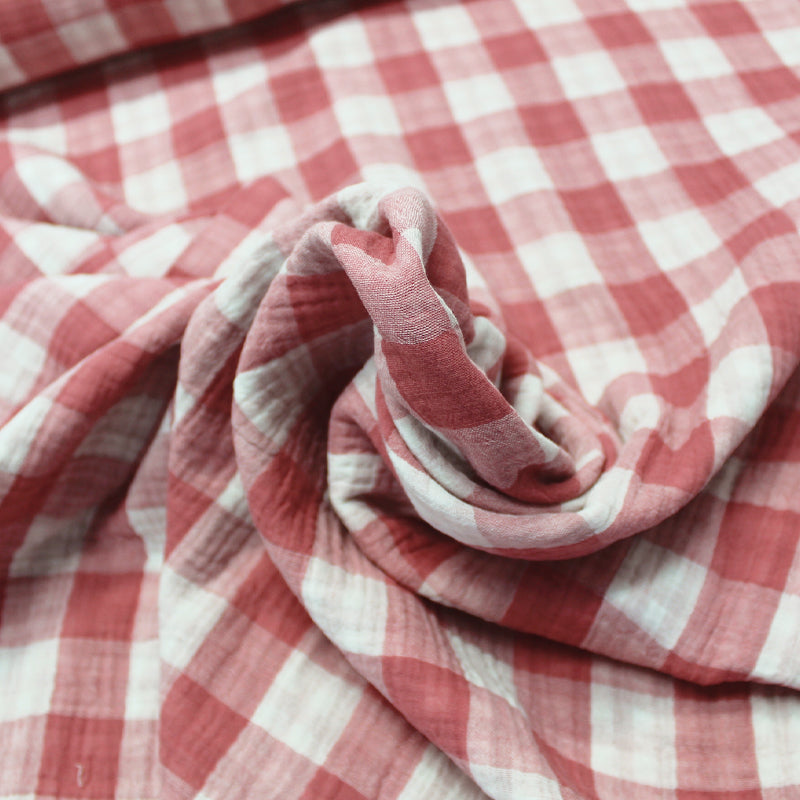 Gorgeous double-sided rose pink gingham double gauze features a larger pink gingham pattern with a smaller pink gingham check pattern on the reverse.