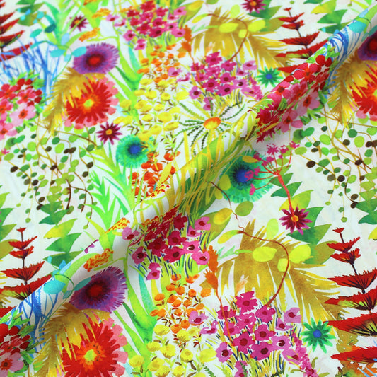 A gorgeous yellow floral cotton fabric featuring a tiny white floral print on a sunshine yellow background. In high quality 100% cotton this represents great value and it is perfect for summer dressmaking, either a dress, blouse or skirt. With a wide width, it is also suitable for patchwork and quilting. A great value low price cotton.