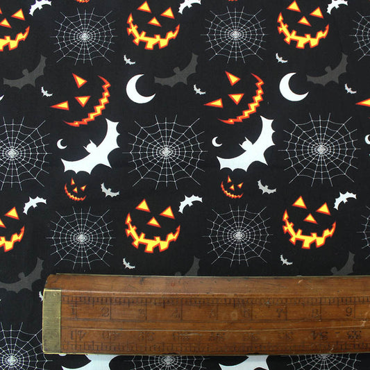 Fun Halloween fabric featuring friendly ghosts, cauldrons and orange pumpkins on a black cotton background. In high quality cotton it is perfect for Halloween crafting and costumes.