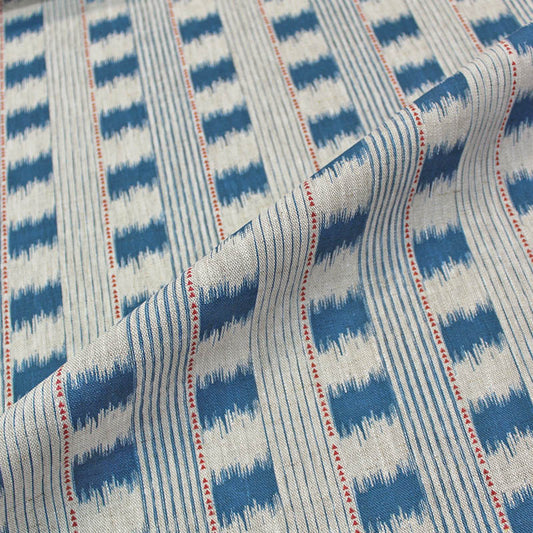 A gorgeous Ikat fabric in a lovely navy and cream colour featuring an attractive geometric print on a high quality blend of cotton and linen furnishing weight fabric. With a Martindale of 45,000 it is suitable for domestic upholstery, curtains, blinds and cushions.