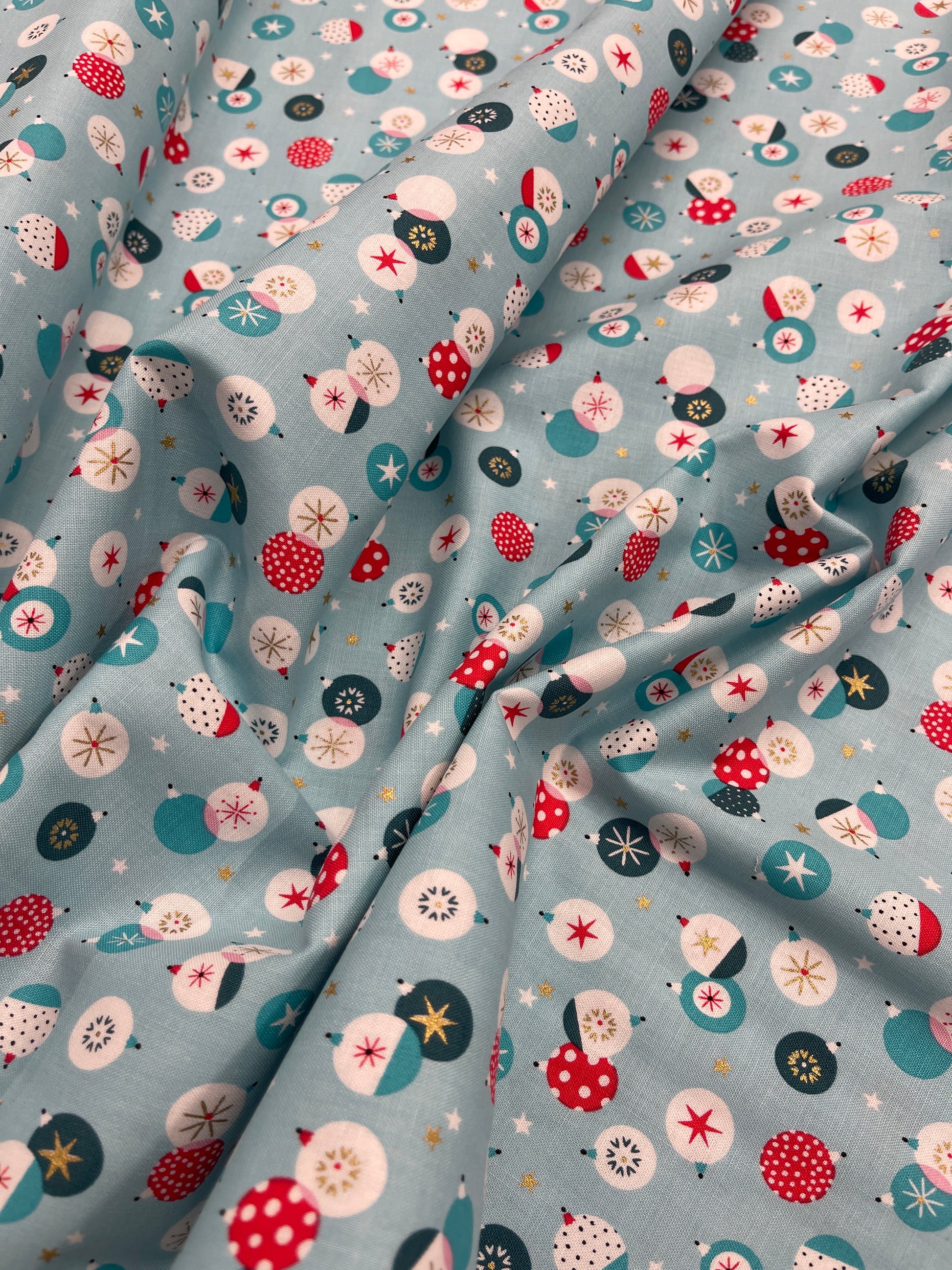 A gorgeous Christmas fabric featuring a blue and metallic gold snowflake print on a white background. In high quality cotton, it is perfect for all Christmas crafting, patchwork and quilting projects.