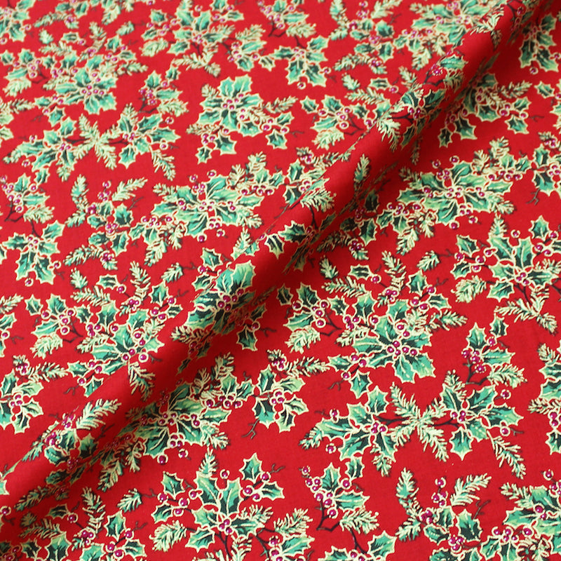 This festive berry print is a traditional Christmas fabric featuring gorgeous green holly enhanced by a metallic gold outline on a red fabric background. This is yet another high quality soft extra fine weave cotton from Rose & Hubble included in our Christmas fabric collection.