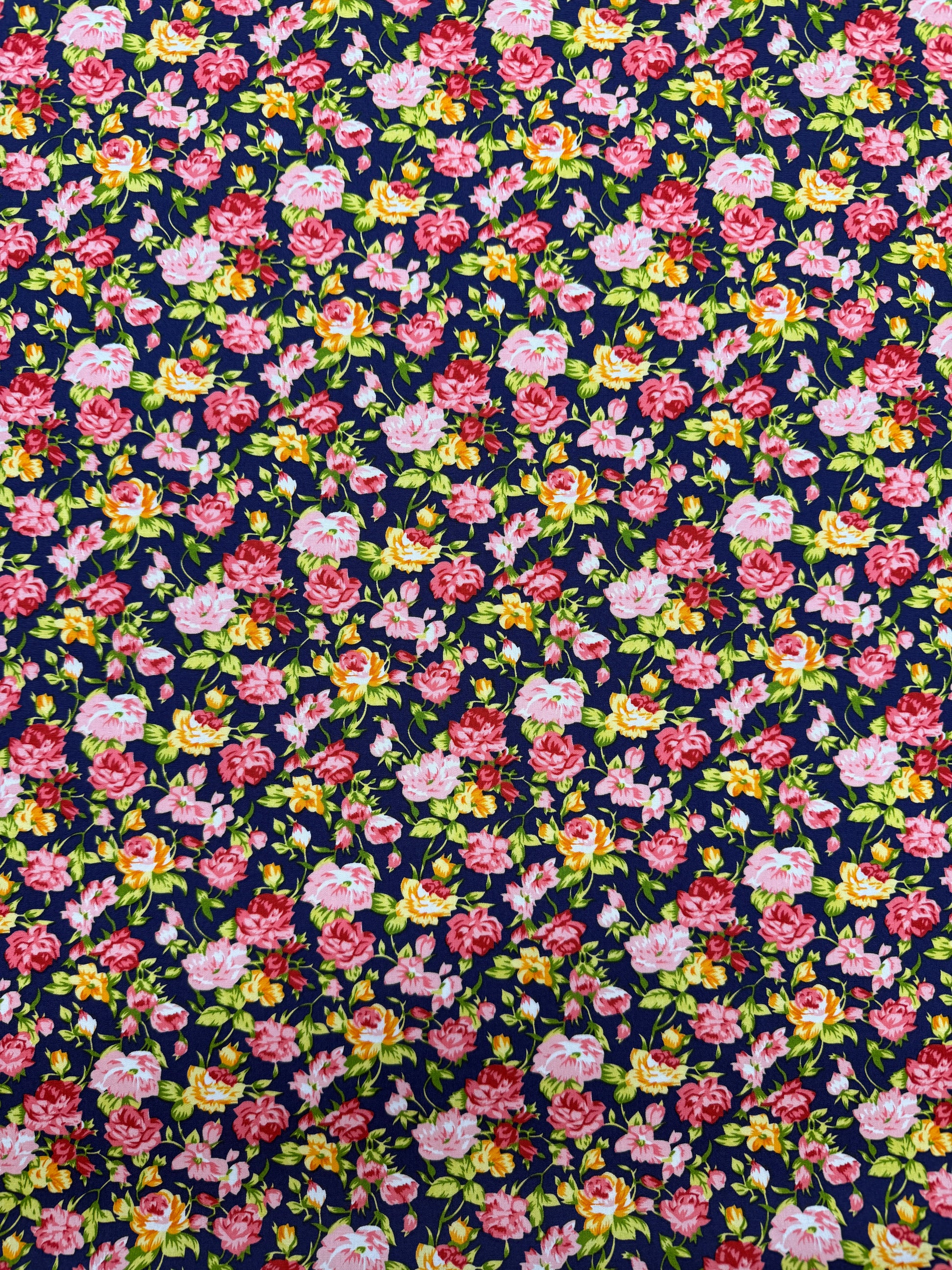 A gorgeous floral cotton poplin featuring bold flowers with smaller blooms on a navy blue cotton background. This is a lovely summer dressmaking fabric which would make a gorgeous blouse, top or even a dress.