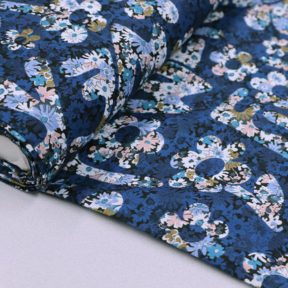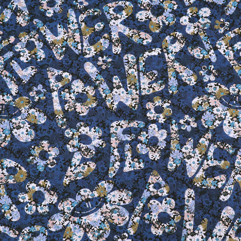 A gorgeous Liberty floral print in their unique Tana Lawn™ Cotton featuring the words Flower Power written in a floral font on a blue floral silhouette background.