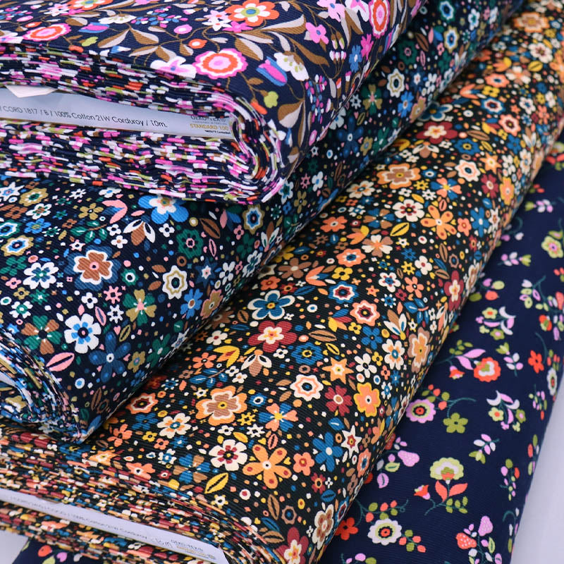 A gorgeous needlecord fabric featuring a pretty yellow and blue floral print on a black background. In 100% cotton this black floral needlecord fabric is perfect for dressmaking and would make a lovely pinafore dress, skirt or trousers for children and adults alike.