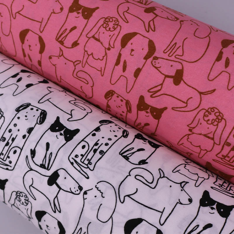 A gorgeous brushed cotton featuring different breeds of dogs outlined in black on a white flannel background.