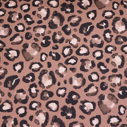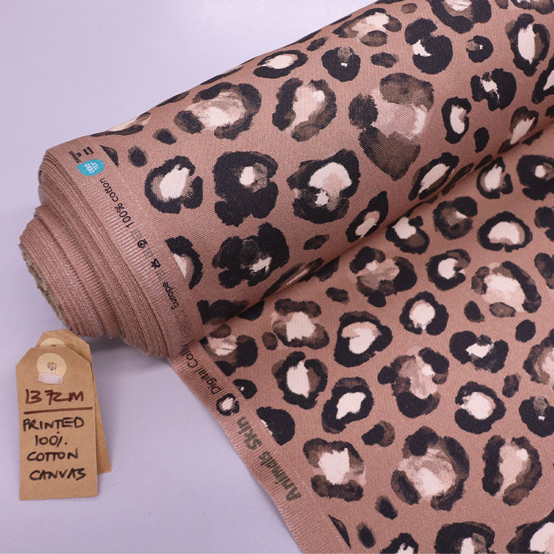 A fantastic leopard print fabric on a brown 100% cotton canvas perfect for trousers or a jacket. The leopard print looks as if it is painted on the high quality cotton which also meets OEKO-TEX 100.