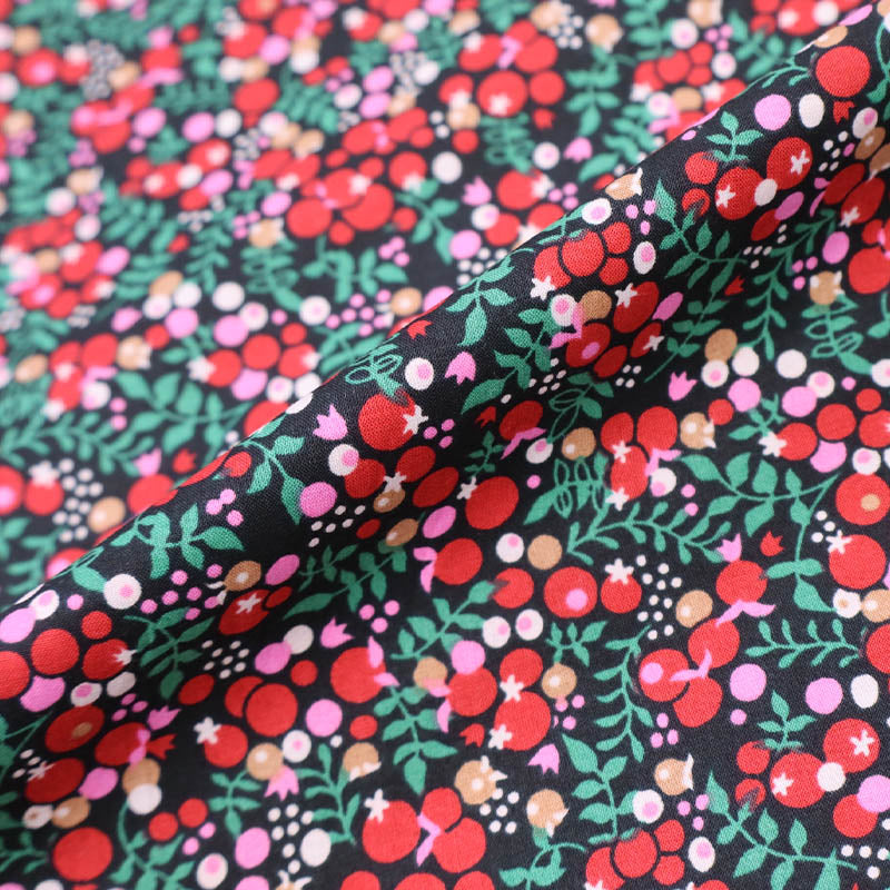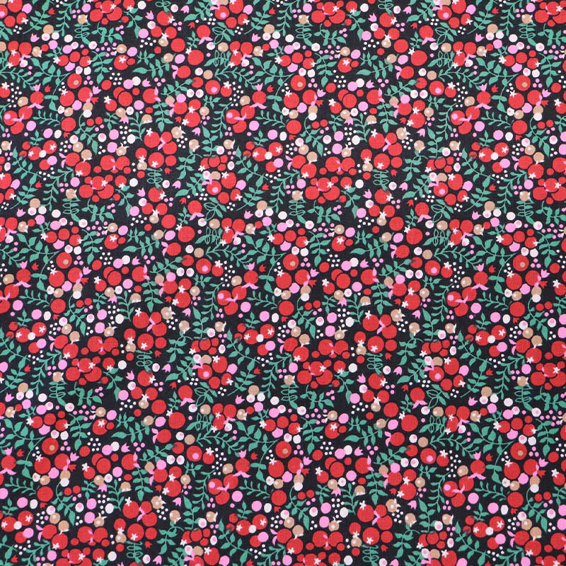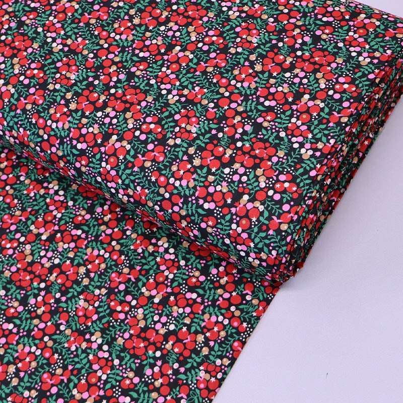 Gorgeous cotton lawn fabric in a small print featuring red berries with green leaves on a black background. Perfect for summer dressmaking, this would make a lovely dress, skirt or blouse.