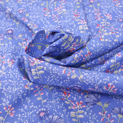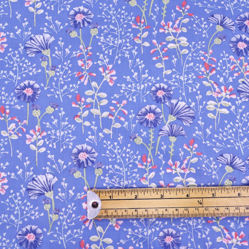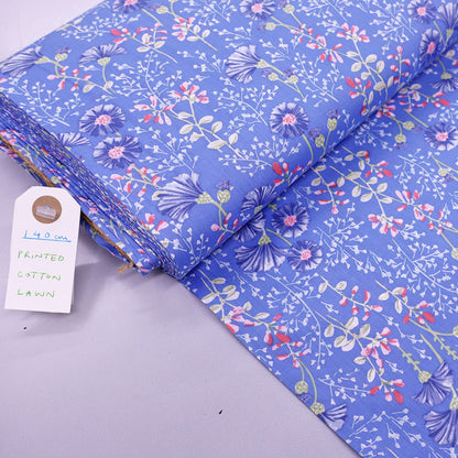 A gorgeous cotton lawn fabric featuring a pretty meadow flower print in blue, pink and white on a cornflower blue background. Cotton lawn is perfect for summer dressmaking and this would make a lovely blouse, skirt or dress.