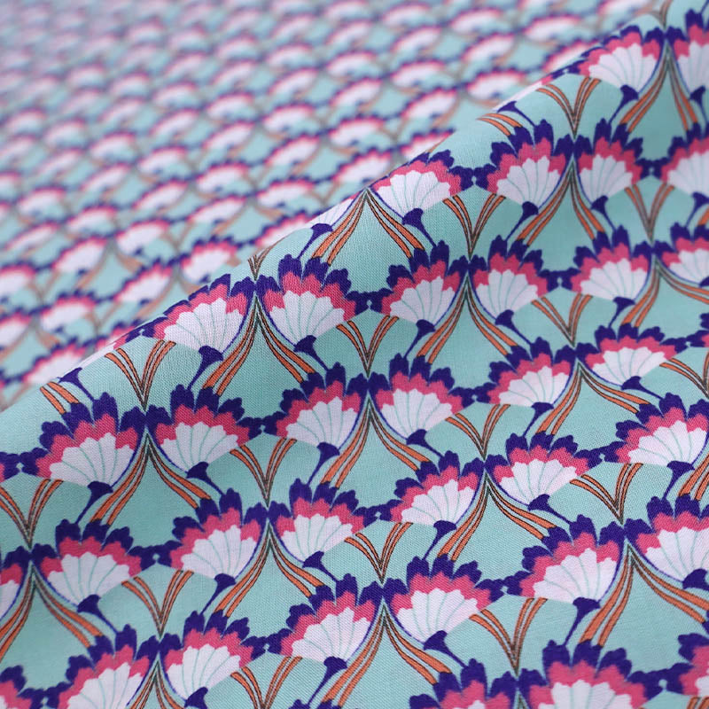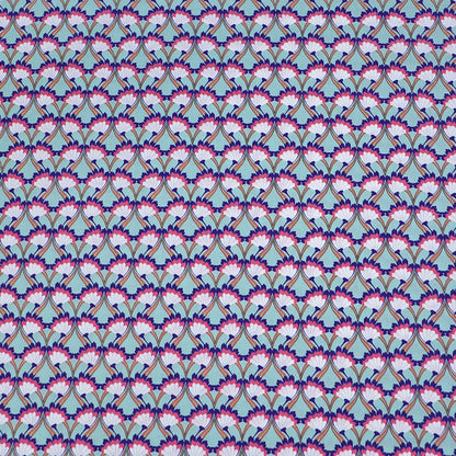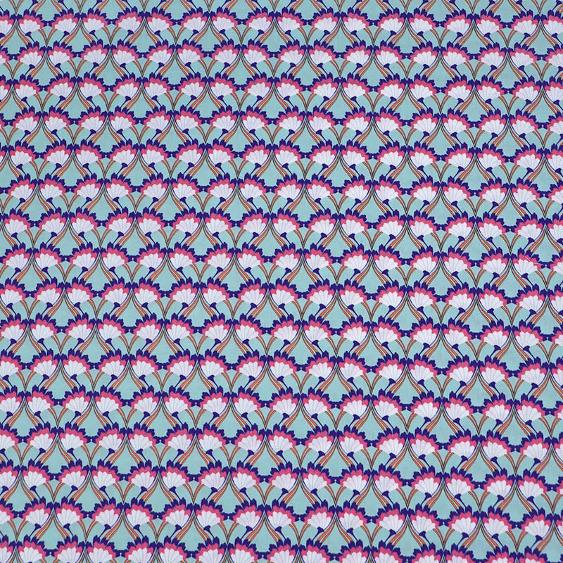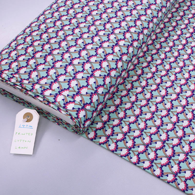 A gorgeous cotton lawn fabric featuring an art deco style floral print in dark blue, pink and white on a mint green background. In 100% cotton lawn this is perfect for summer dressmaking and would make a lovely dress, skirt or top.
