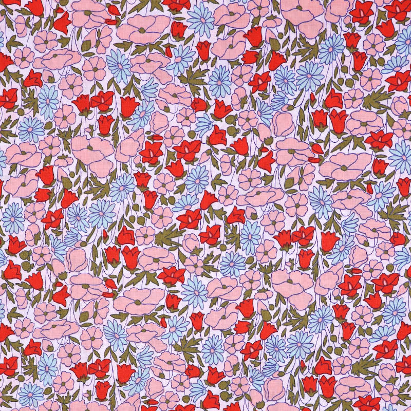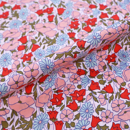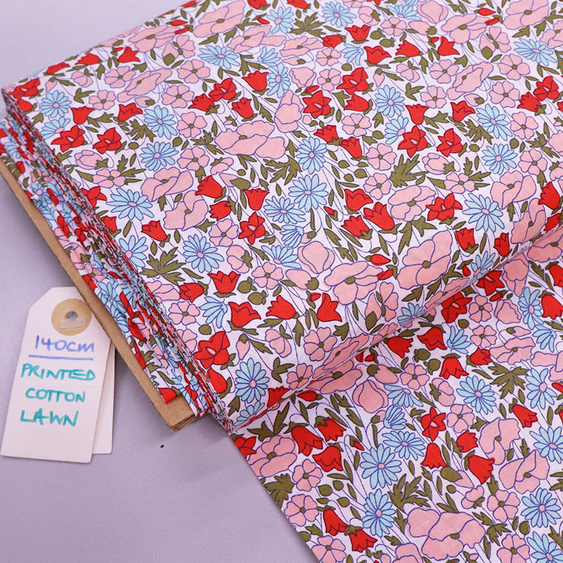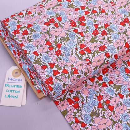 A gorgeous cotton lawn featuring a pink, red and pale blue floral print on a white background. In high quality 100% cotton lawn, this is perfect for summer dressmaking and would make a lovely pink floral dress, skirt, blouse or nightwear.