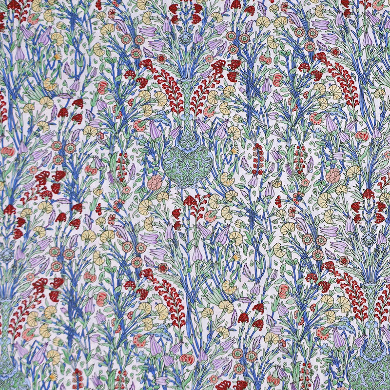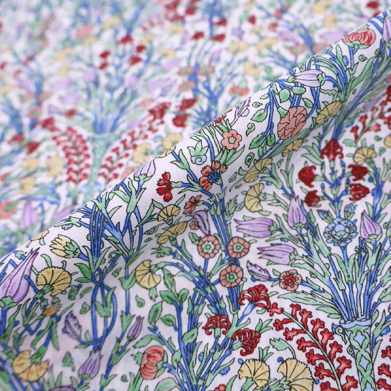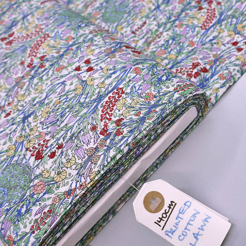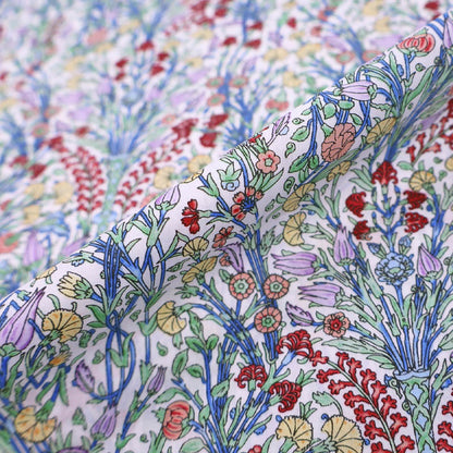 A beautiful cotton lawn fabric featuring a pretty floral print in blues, greens, red, yellow and lilac on a white background. In high quality 100% cotton lawn, it is perfect for summer dressmaking and nightwear.