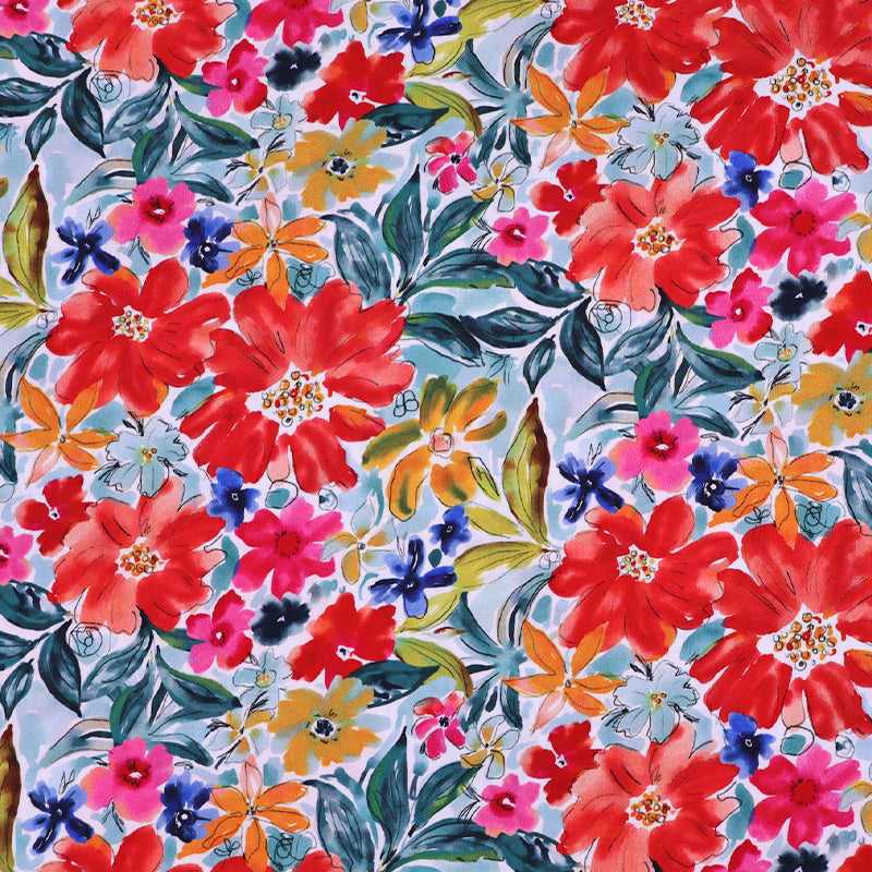 Gorgeous viscose fabric featuring a watercolour style print of red and yellow blooms with green leaves on a white background. With a lovely drape it is perfect for summer dressmaking and would make a fantastic red floral dress, skirt or blouse.