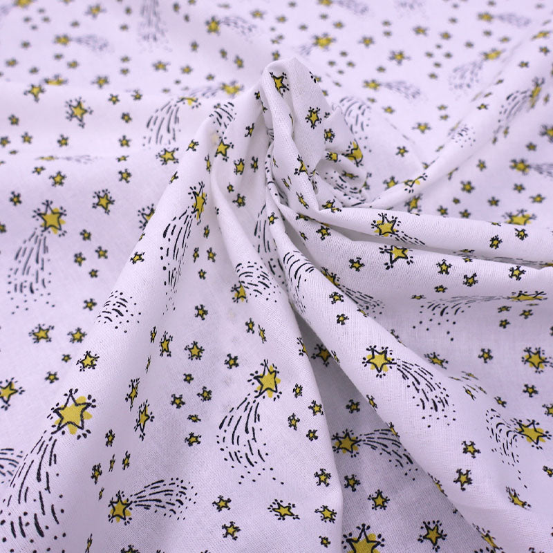 Gorgeous cotton fabric featuring different size yellow and grey stars on a white background. Perfect for all patchwork and quilting as it comes in a wide width which is also excellent for dressmaking.