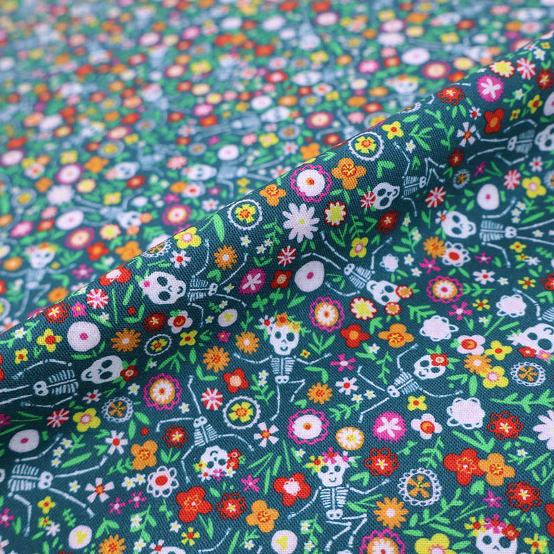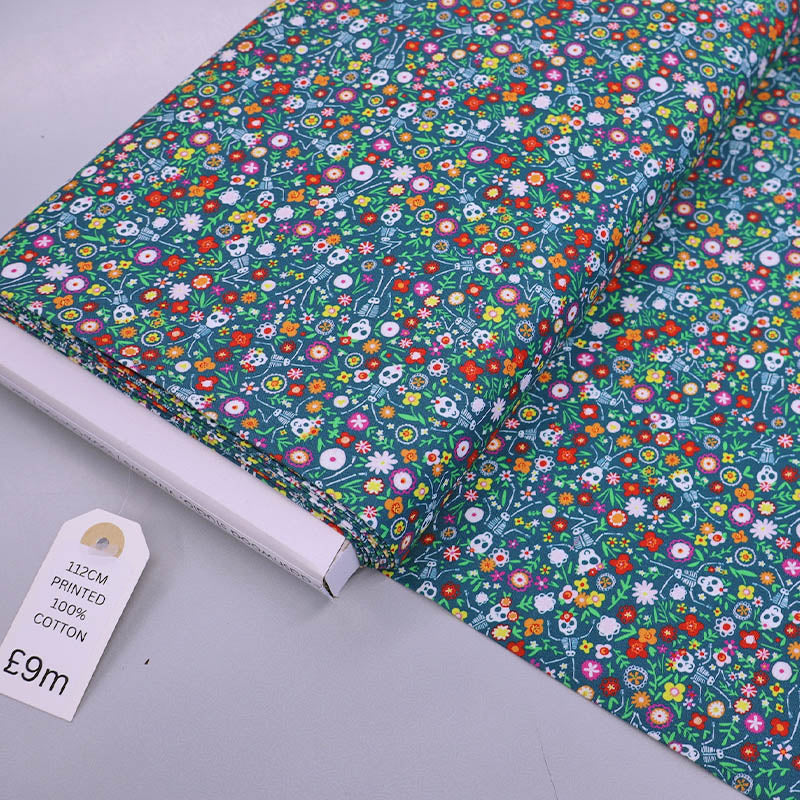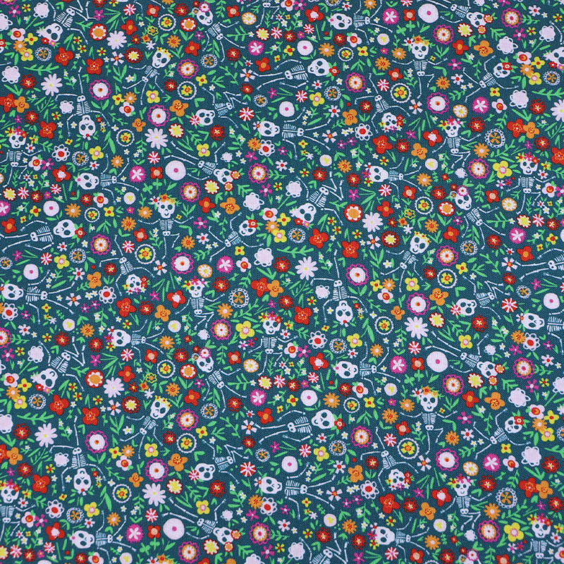 A gorgeous fun floral print featuring subtle smiling skeletons among the pretty flowers on a petrol green background. Perfect for quilting and dressmaking, it would make a lovely dress, skirt or blouse.