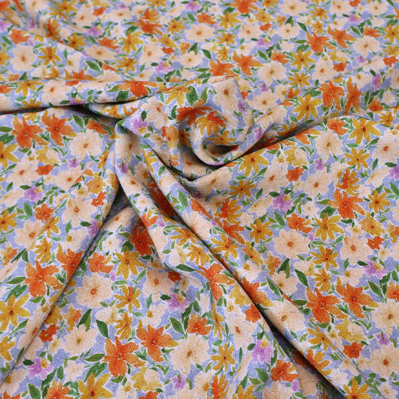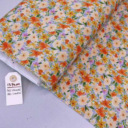 Gorgeous viscose and linen blend fabric featuring an orange, peach and lilac floral design on a pale blue background. Perfect for summer dressmaking and would make a lovely dress, skirt or blouse.