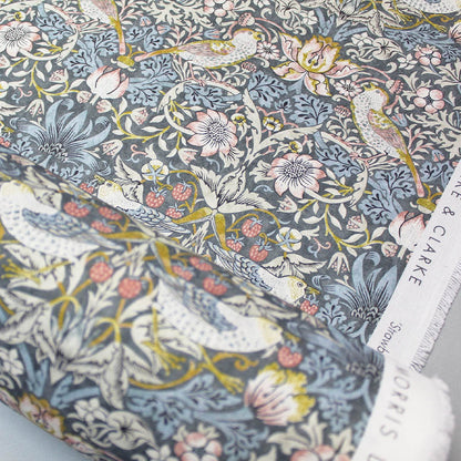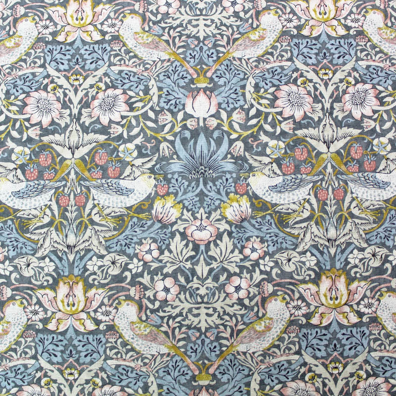 Strawberry Thief is the most famous of all the William Morris fabric designs and this iconic print featuring florals and birds is as popular today as it has always been. In a slate grey and blue with hints of pink colour-way, this is a high quality cotton panama furnishing fabric which would make gorgeous curtains, blinds and cushions. With a Martindale of 20000, it can also be used for upholstery in general domestic use.